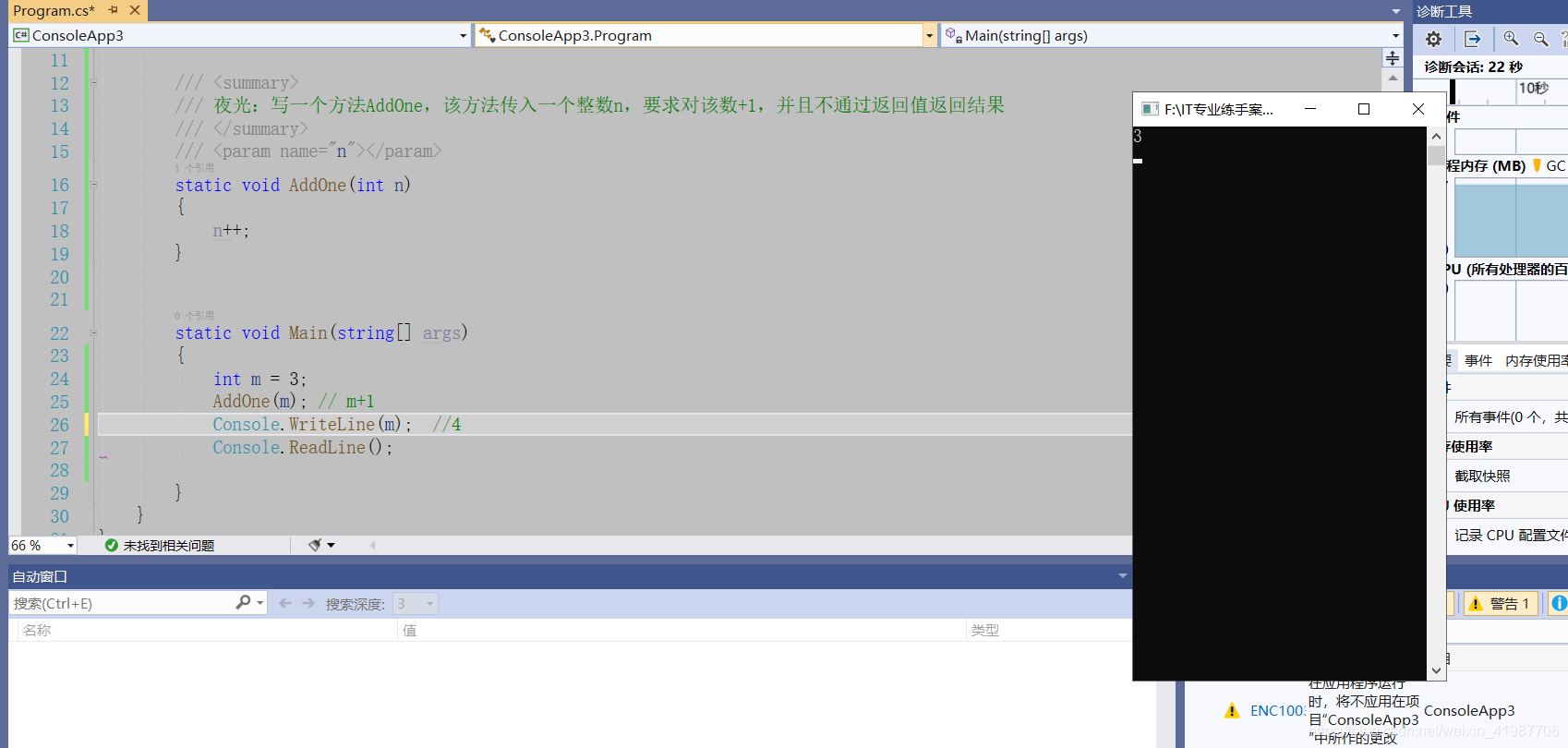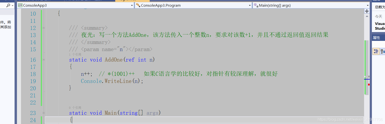 using System;using System.Collections.Generic;using System.Linq;using System.Text;using System.Threading.Tasks;namespace ConsoleApp3{ class Program { /// /// 夜光:写一个方法AddOne,该方法传入一个整数n,要求对该数+1,并且不通过返回值返回结果 /// /// static void AddOne(int n) { n++; } static void Main(string[] args) { int m = 3; AddOne(m); // m+1 Console.WriteLine(m); //4 Console.ReadLine(); } }}