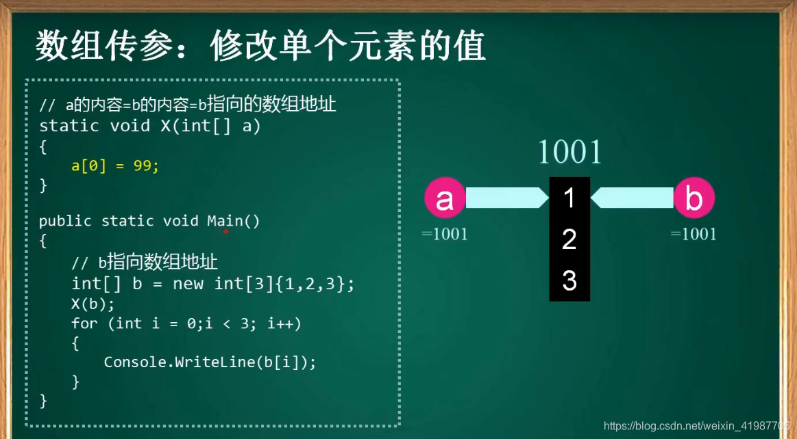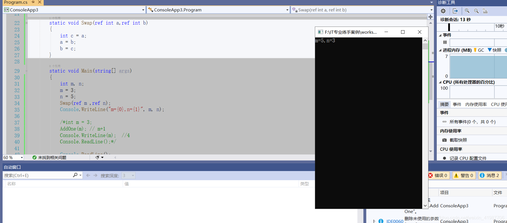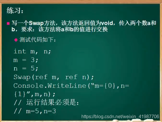 using System;using System.Collections.Generic;using System.Linq;using System.Text;using System.Threading.Tasks;namespace ConsoleApp3{ class Program { /// /// 夜光:写一个方法AddOne,该方法传入一个整数n,要求对该数+1,并且不通过返回值返回结果 /// /// static void AddOne(ref int n) { n++; // *(1001)++ 如果C语言学的比较好,对指针有较深理解,就很好 Console.WriteLine(n); } static void Swap(ref int a,ref int b) { int c = a; a = b; b = c; } static void Main(string[] args) { int m, n; m = 3; n = 5; Swap(ref m ,ref n); Console.WriteLine("m={0},n={1}", m, n); /*int m = 3; AddOne(m); // m+1 Console.WriteLine(m); //4 Console.ReadLine();*/ Console.ReadLine(); } }}
