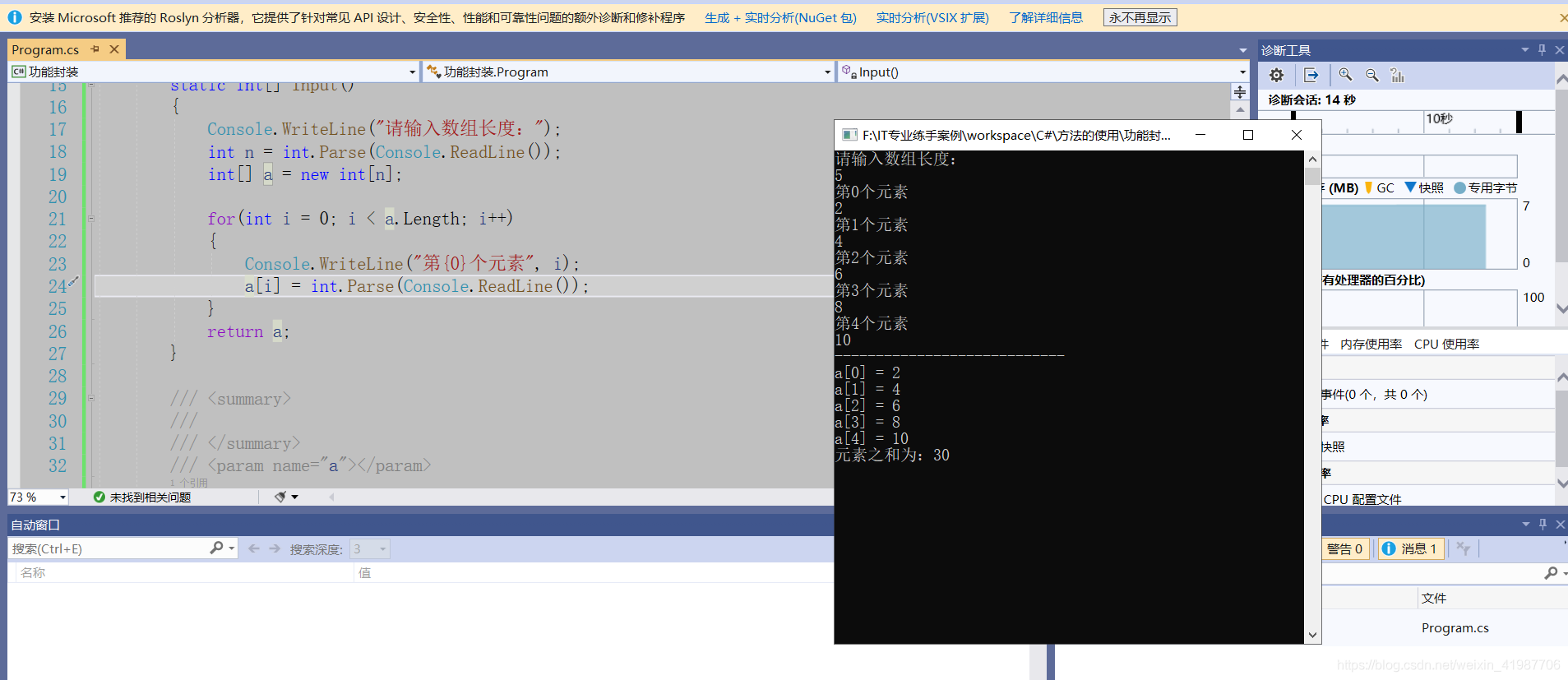 using System;using System.Collections.Generic;using System.Linq;using System.Text;using System.Threading.Tasks;namespace 功能封装{ class Program { /// /// /// /// static int[] Input() { Console.WriteLine("请输入数组长度:"); int n = int.Parse(Console.ReadLine()); int[] a = new int[n]; for(int i = 0; i < a.Length; i++) { Console.WriteLine("第{0}个元素", i); a[i] = int.Parse(Console.ReadLine()); } return a; } /// /// /// /// static void Output(int[] a) { Console.WriteLine("----------------------------"); for (int i = 0; i< a.Length; i++) { Console.WriteLine("a[{0}] = {1}", i, a[i]); } } /// /// /// /// /// static int Sum(int[] a) { int s = 0; for (int i = 0; i < a.Length; i++) { s += a[i]; } /* Console.WriteLine("元素之和为:{0}",s);*/ return s; } static void Main(string[] args) { int[] b = Input(); Output(b); int n = Sum(b); Console.WriteLine("元素之和为:{0}", n); Console.ReadLine(); } }}