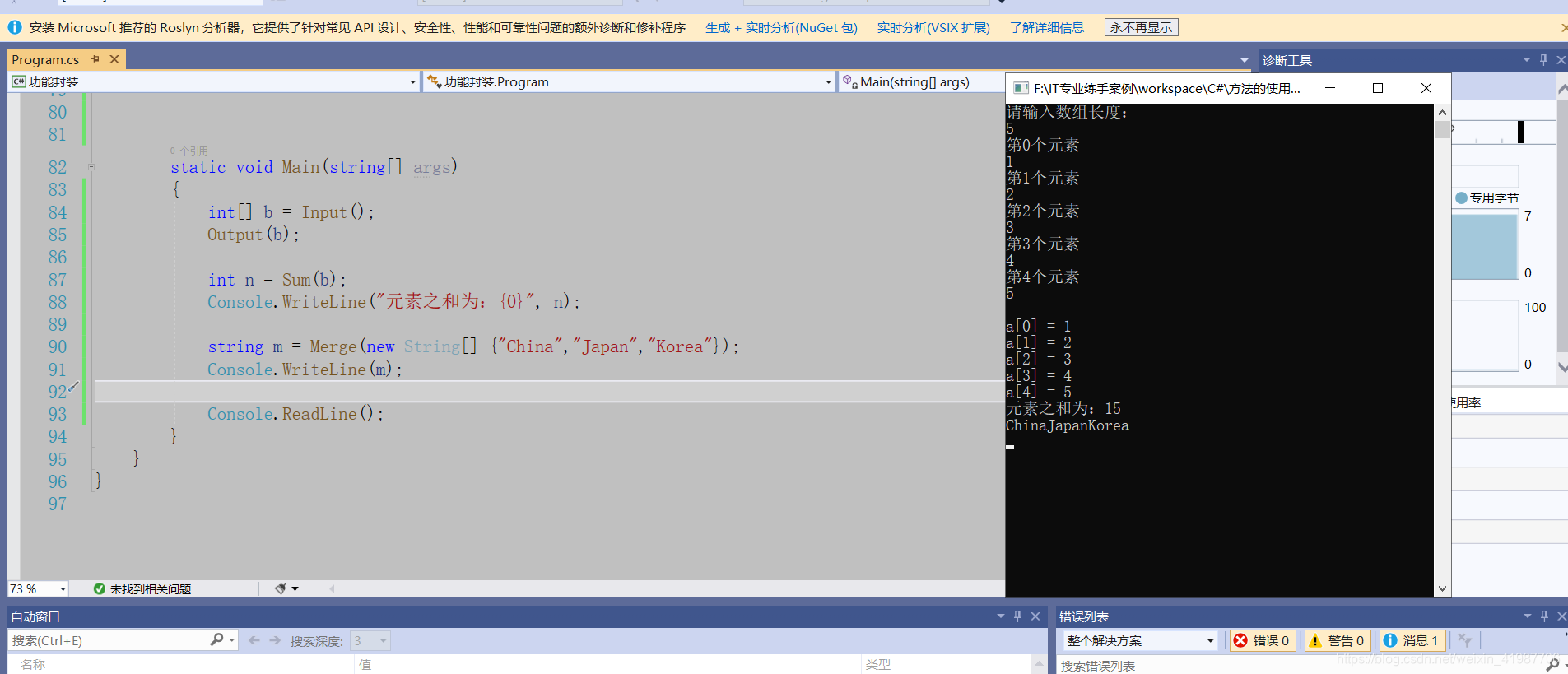 using System;using System.Collections.Generic;using System.Linq;using System.Text;using System.Threading.Tasks;namespace 功能封装{ class Program { /// /// /// /// static int[] Input() { Console.WriteLine("请输入数组长度:"); int n = int.Parse(Console.ReadLine()); int[] a = new int[n]; for(int i = 0; i < a.Length; i++) { Console.WriteLine("第{0}个元素", i); a[i] = int.Parse(Console.ReadLine()); } return a; } /// /// /// /// static void Output(int[] a) { Console.WriteLine("----------------------------"); for (int i = 0; i< a.Length; i++) { Console.WriteLine("a[{0}] = {1}", i, a[i]); } } /// /// /// /// /// static int Sum(int[] a) { int s = 0; for (int i = 0; i < a.Length; i++) { s += a[i]; } /* Console.WriteLine("元素之和为:{0}",s);*/ return s; } /// /// /// /// /// static string Merge(string[] sa) { string m = ""; for(int i = 0; i < sa.Length; i++) { m += sa[i]; } return m; } static void Main(string[] args) { int[] b = Input(); Output(b); int n = Sum(b); Console.WriteLine("元素之和为:{0}", n); string m = Merge(new String[] {"China","Japan","Korea"}); Console.WriteLine(m); Console.ReadLine(); } }}