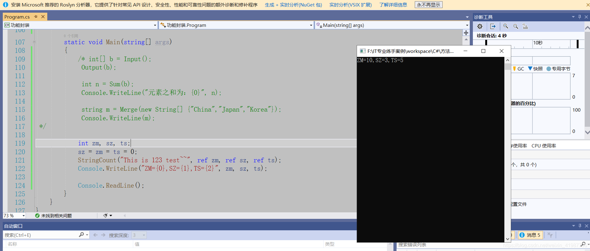 using System;using System.Collections.Generic;using System.Linq;using System.Text;using System.Threading.Tasks;namespace 功能封装{ class Program { /// /// 夜光:输入 /// /// static int[] Input() { Console.WriteLine("请输入数组长度:"); int n = int.Parse(Console.ReadLine()); int[] a = new int[n]; for(int i = 0; i < a.Length; i++) { Console.WriteLine("第{0}个元素", i); a[i] = int.Parse(Console.ReadLine()); } return a; } /// /// 夜光:输出 /// /// static void Output(int[] a) { Console.WriteLine("----------------------------"); for (int i = 0; i< a.Length; i++) { Console.WriteLine("a[{0}] = {1}", i, a[i]); } } /// /// /// /// /// static int Sum(int[] a) { int s = 0; for (int i = 0; i < a.Length; i++) { s += a[i]; } /* Console.WriteLine("元素之和为:{0}",s);*/ return s; } /// /// 夜光:拼接字符串 /// /// /// static string Merge(string[] sa) { string m = ""; for(int i = 0; i < sa.Length; i++) { m += sa[i]; } return m; } /// /// 夜光 /// /// static void StringCount(string s,ref int zm,ref int sz,ref int ts) { zm = 0; sz = 0; ts = 0; for(int i = 0; i < s.Length; i++) { if (Char.IsLetter(s[i])) { zm++; } else if(Char.IsDigit(s[i])) { sz++; } else { ts++; } } } static void Main(string[] args) { /* int[] b = Input(); Output(b); int n = Sum(b); Console.WriteLine("元素之和为:{0}", n); string m = Merge(new String[] {"China","Japan","Korea"}); Console.WriteLine(m); */ int zm, sz, ts; sz = zm = ts = 0; StringCount("This is 123 test~~", ref zm, ref sz, ref ts); Console.WriteLine("ZM={0},SZ={1},TS={2}", zm, sz, ts); Console.ReadLine(); } }}
