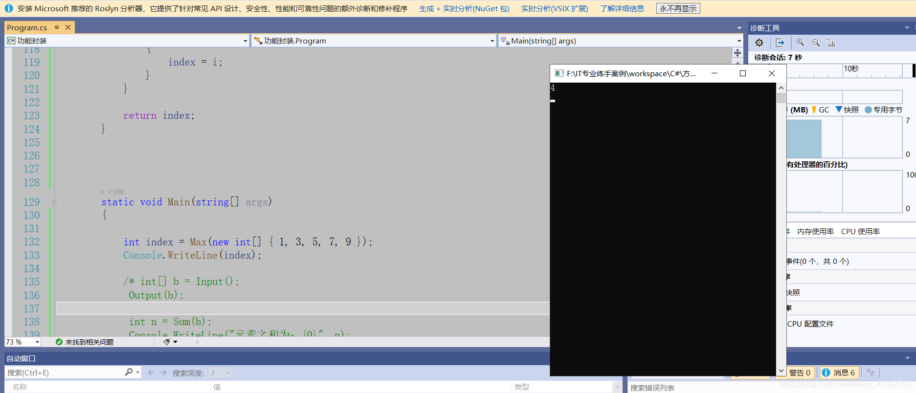 using System;using System.Collections.Generic;using System.Linq;using System.Text;using System.Threading.Tasks;namespace 功能封装{ class Program { /// /// 夜光:输入 /// /// static int[] Input() { Console.WriteLine("请输入数组长度:"); int n = int.Parse(Console.ReadLine()); int[] a = new int[n]; for(int i = 0; i < a.Length; i++) { Console.WriteLine("第{0}个元素", i); a[i] = int.Parse(Console.ReadLine()); } return a; } /// /// 夜光:输出 /// /// static void Output(int[] a) { Console.WriteLine("----------------------------"); for (int i = 0; i< a.Length; i++) { Console.WriteLine("a[{0}] = {1}", i, a[i]); } } /// /// /// /// /// static int Sum(int[] a) { int s = 0; for (int i = 0; i < a.Length; i++) { s += a[i]; } /* Console.WriteLine("元素之和为:{0}",s);*/ return s; } /// /// 夜光:拼接字符串 /// /// /// static string Merge(string[] sa) { string m = ""; for(int i = 0; i < sa.Length; i++) { m += sa[i]; } return m; } /// /// 夜光 /// /// static void StringCount(string s,ref int zm,ref int sz,ref int ts) { zm = 0; sz = 0; ts = 0; for(int i = 0; i < s.Length; i++) { if (Char.IsLetter(s[i])) { zm++; } else if(Char.IsDigit(s[i])) { sz++; } else { ts++; } } } /// /// 写一个循环,夜光:找出最大的数 /// /// /// static int Max(int[] a) { int index = 0; //我们先定义一个下标 for(int i = 1; i < a.Length; i++) //从1开始,和那个最大的进行比较 { if(a[i] > a[index]) { index = i; } } return index; } static void Main(string[] args) { int index = Max(new int[] { 1, 3, 5, 7, 9 }); Console.WriteLine(index); /* int[] b = Input(); Output(b); int n = Sum(b); Console.WriteLine("元素之和为:{0}", n); string m = Merge(new String[] {"China","Japan","Korea"}); Console.WriteLine(m); *//* int zm, sz, ts; sz = zm = ts = 0; StringCount("This is 123 test~~", ref zm, ref sz, ref ts); Console.WriteLine("ZM={0},SZ={1},TS={2}", zm, sz, ts);*/ Console.ReadLine(); } }}