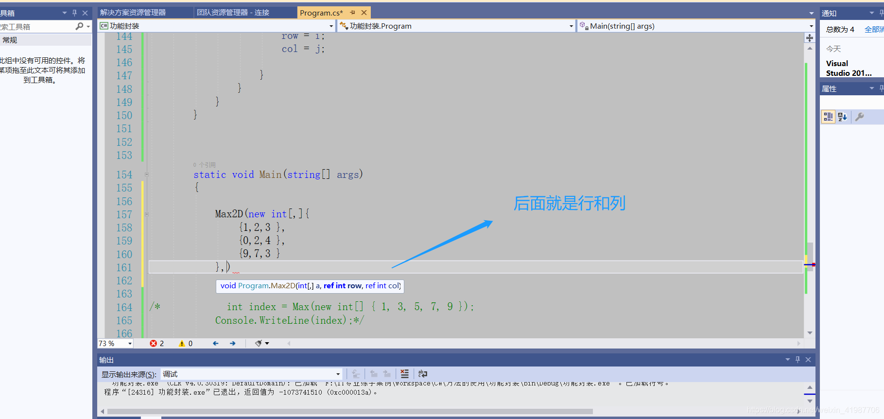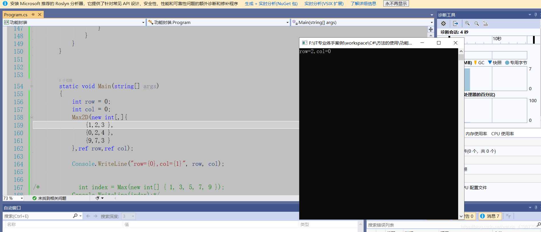 using System;using System.Collections.Generic;using System.Linq;using System.Text;using System.Threading.Tasks;namespace 功能封装{ class Program { /// /// 夜光:输入 /// /// static int[] Input() { Console.WriteLine("请输入数组长度:"); int n = int.Parse(Console.ReadLine()); int[] a = new int[n]; for(int i = 0; i < a.Length; i++) { Console.WriteLine("第{0}个元素", i); a[i] = int.Parse(Console.ReadLine()); } return a; } /// /// 夜光:输出 /// /// static void Output(int[] a) { Console.WriteLine("----------------------------"); for (int i = 0; i< a.Length; i++) { Console.WriteLine("a[{0}] = {1}", i, a[i]); } } /// /// /// /// /// static int Sum(int[] a) { int s = 0; for (int i = 0; i < a.Length; i++) { s += a[i]; } /* Console.WriteLine("元素之和为:{0}",s);*/ return s; } /// /// 夜光:拼接字符串 /// /// /// static string Merge(string[] sa) { string m = ""; for(int i = 0; i < sa.Length; i++) { m += sa[i]; } return m; } /// /// 夜光 /// /// static void StringCount(string s,ref int zm,ref int sz,ref int ts) { zm = 0; sz = 0; ts = 0; for(int i = 0; i < s.Length; i++) { if (Char.IsLetter(s[i])) { zm++; } else if(Char.IsDigit(s[i])) { sz++; } else { ts++; } } } /// /// 写一个循环,夜光:找出最大的数 /// /// /// static int Max(int[] a) { int index = 0; //我们先定义一个下标 for(int i = 1; i < a.Length; i++) //从1开始,和那个最大的进行比较 { if(a[i] > a[index]) { index = i; } } return index; } /// /// /// /// /// /// static void Max2D(int[,] a, ref int row,ref int col) { row = 0; col = 0; for(int i = 0; i < a.GetLength(0); i++) { for(int j = 0; j < a.GetLength(1); j++) { if (a[i, j] > a[row, col]) { row = i; col = j; } } } } static void Main(string[] args) { int row = 0; int col = 0; Max2D(new int[,]{ {1,2,3 }, {0,2,4 }, {9,7,3 } },ref row,ref col); Console.WriteLine("row={0},col={1}", row, col);/* int index = Max(new int[] { 1, 3, 5, 7, 9 }); Console.WriteLine(index);*/ /* int[] b = Input(); Output(b); int n = Sum(b); Console.WriteLine("元素之和为:{0}", n); string m = Merge(new String[] {"China","Japan","Korea"}); Console.WriteLine(m); *//* int zm, sz, ts; sz = zm = ts = 0; StringCount("This is 123 test~~", ref zm, ref sz, ref ts); Console.WriteLine("ZM={0},SZ={1},TS={2}", zm, sz, ts);*/ Console.ReadLine(); } }}